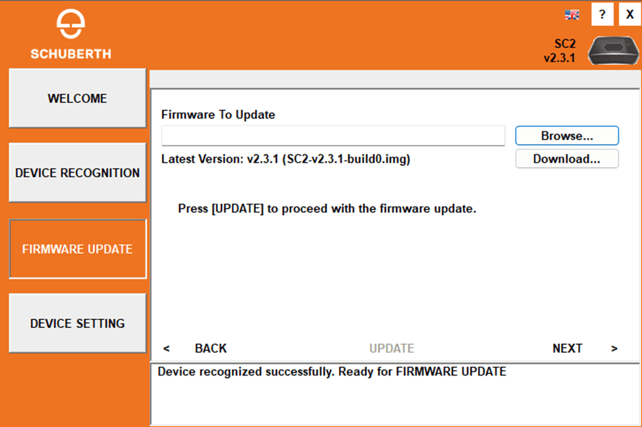 Flestir SCHUBERTH hjálmar nota SENA samskiptatæki. Hægt er að sækja uppfærsluforritið SCHUBERTH Bluetooth Device Manager og ítarlegar leiðbeiningar á: